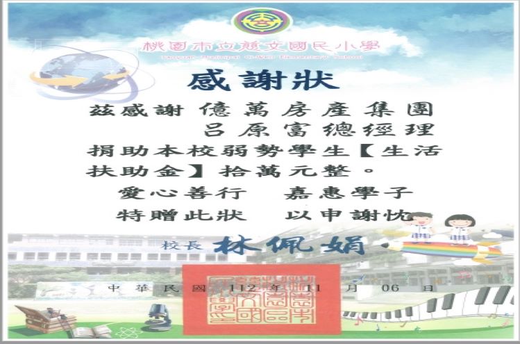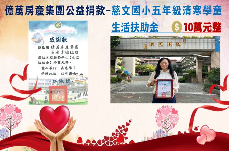 慈文國小-五年級清寒生-經濟弱勢生活扶助金10萬元整